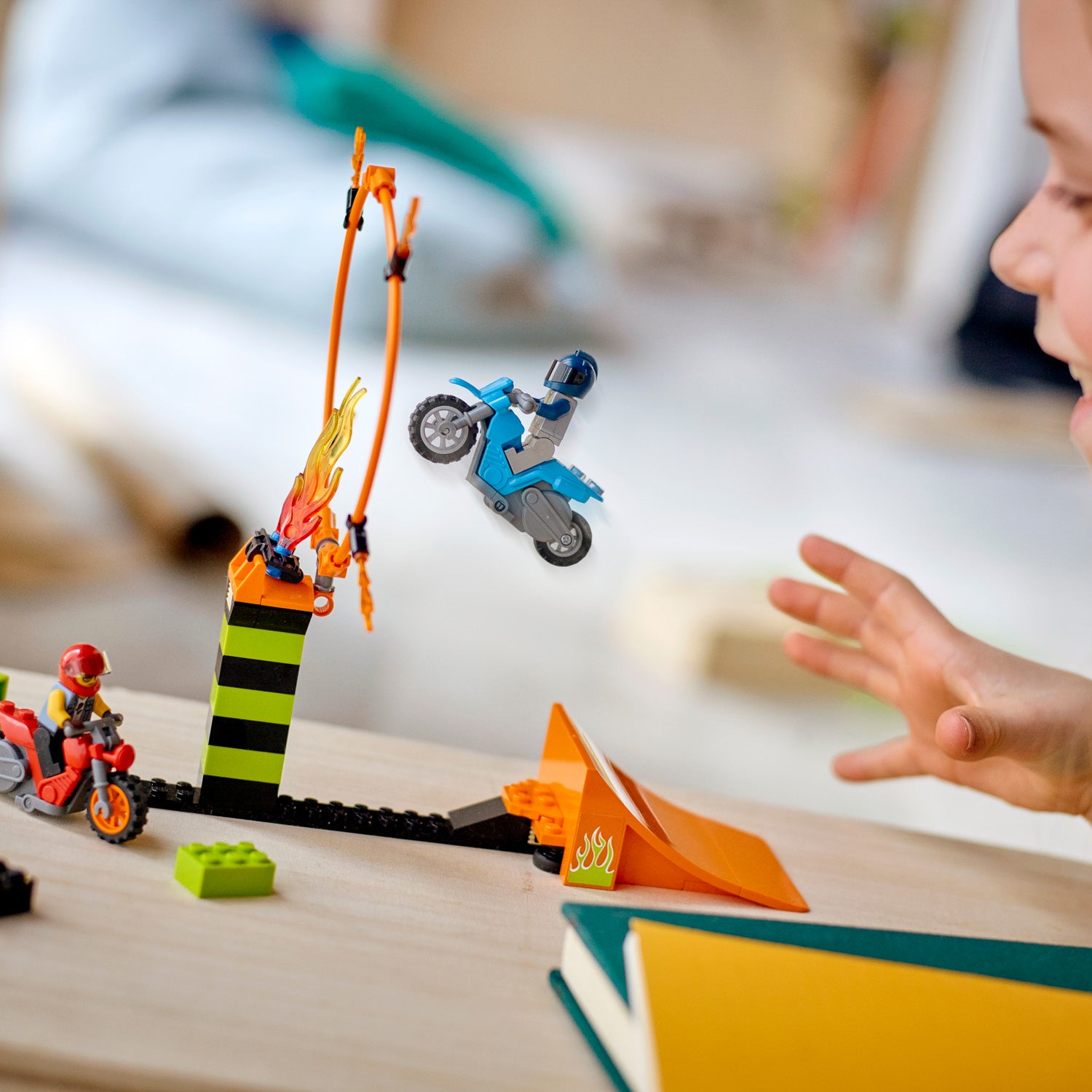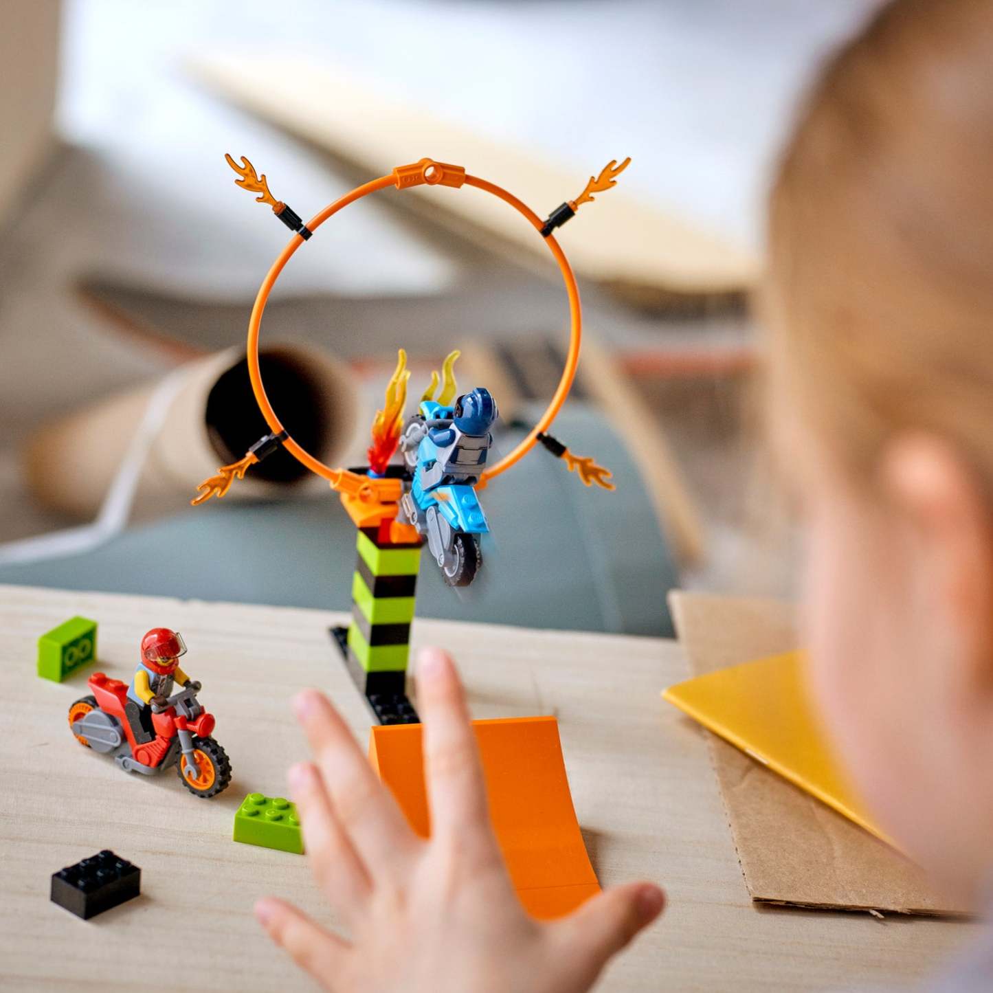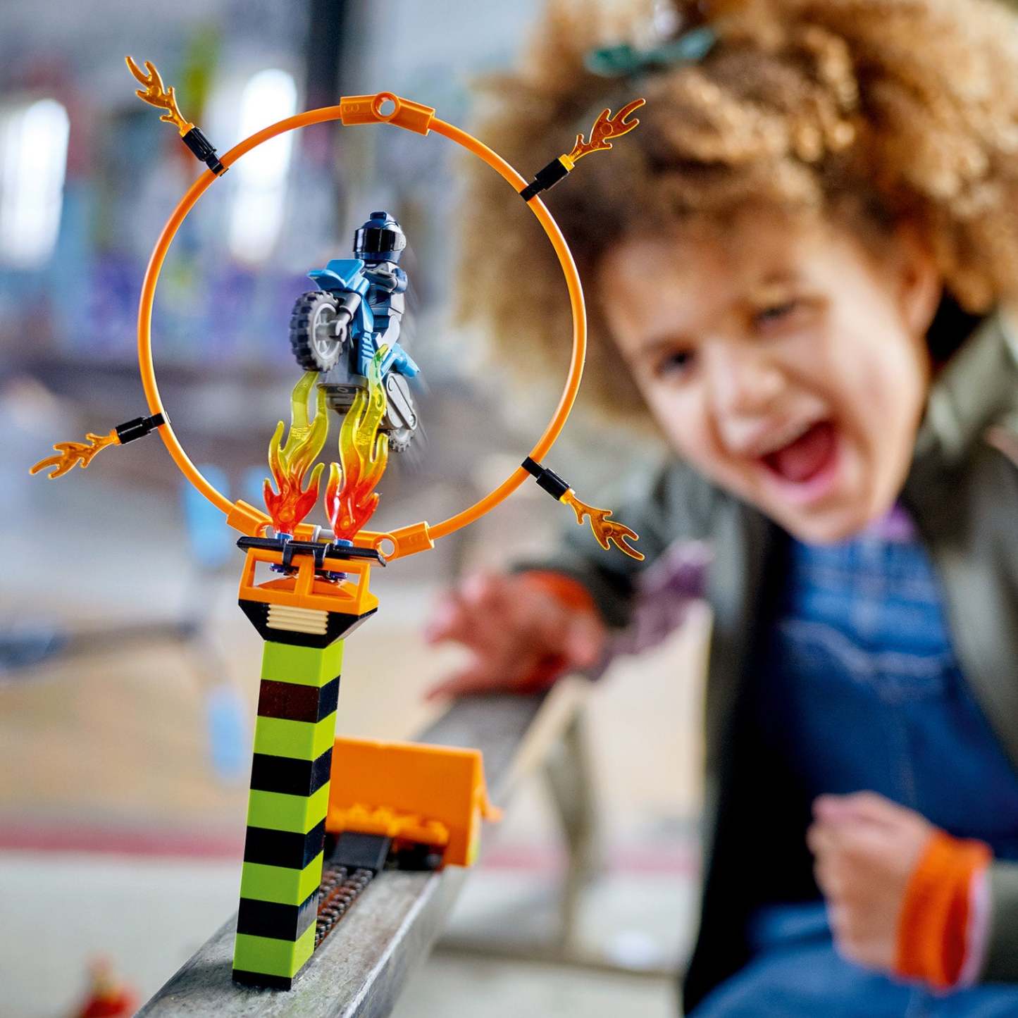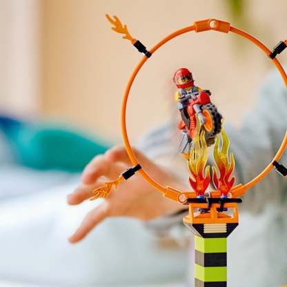 - Kids can activate the flywheel stunt bikes and launch from the ramp to soar through the ring of fire, then lengthen the jump and increase the height of the ring to increase the difficulty!