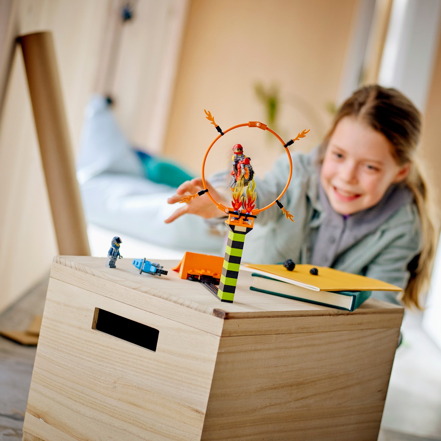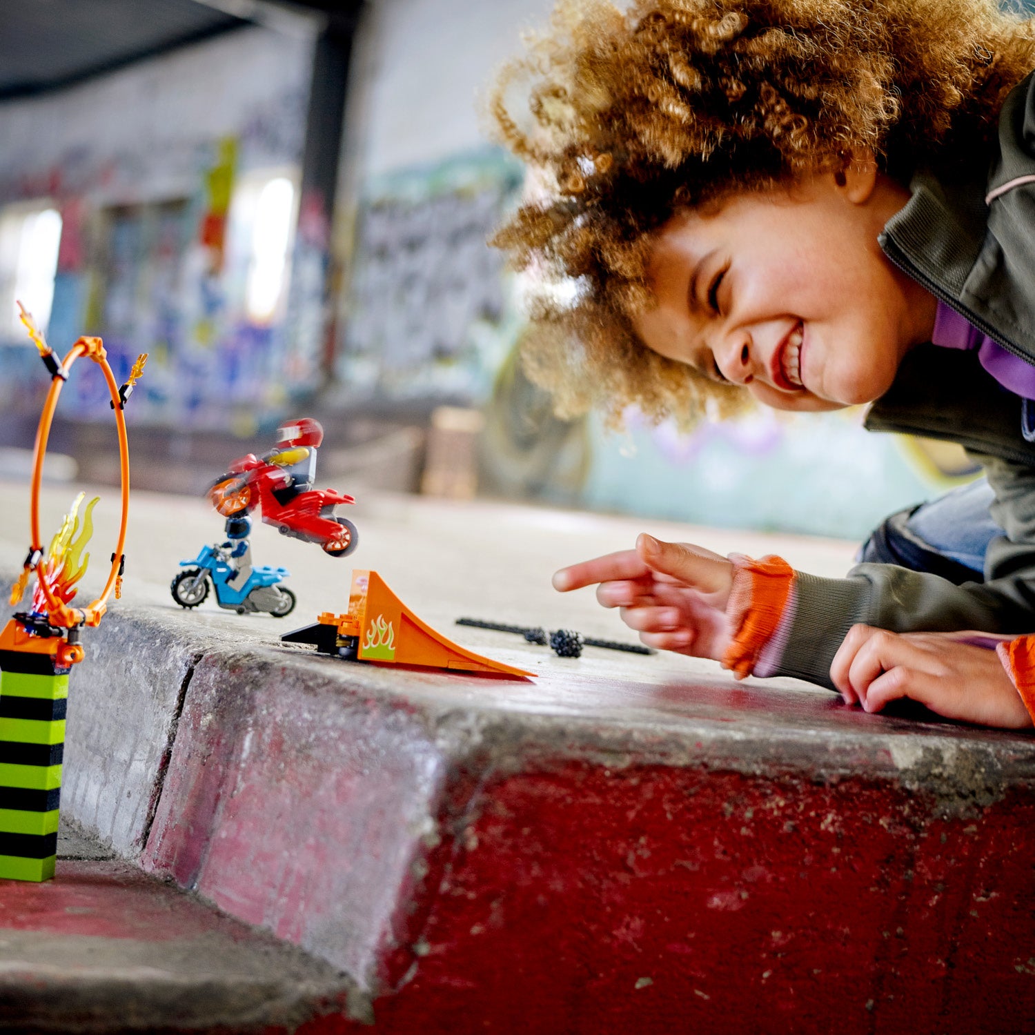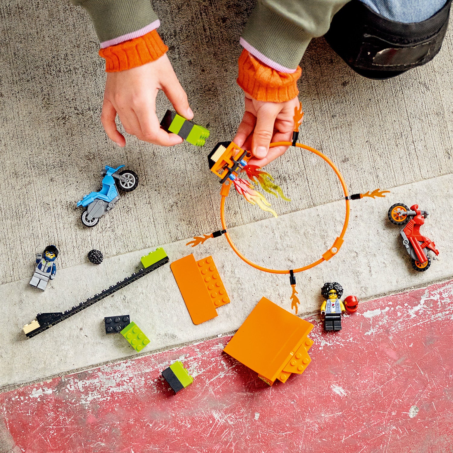 - Kids can activate the flywheel stunt bikes and launch from the ramp to soar through the ring of fire, then lengthen the jump and increase the height of the ring to increase the difficulty!