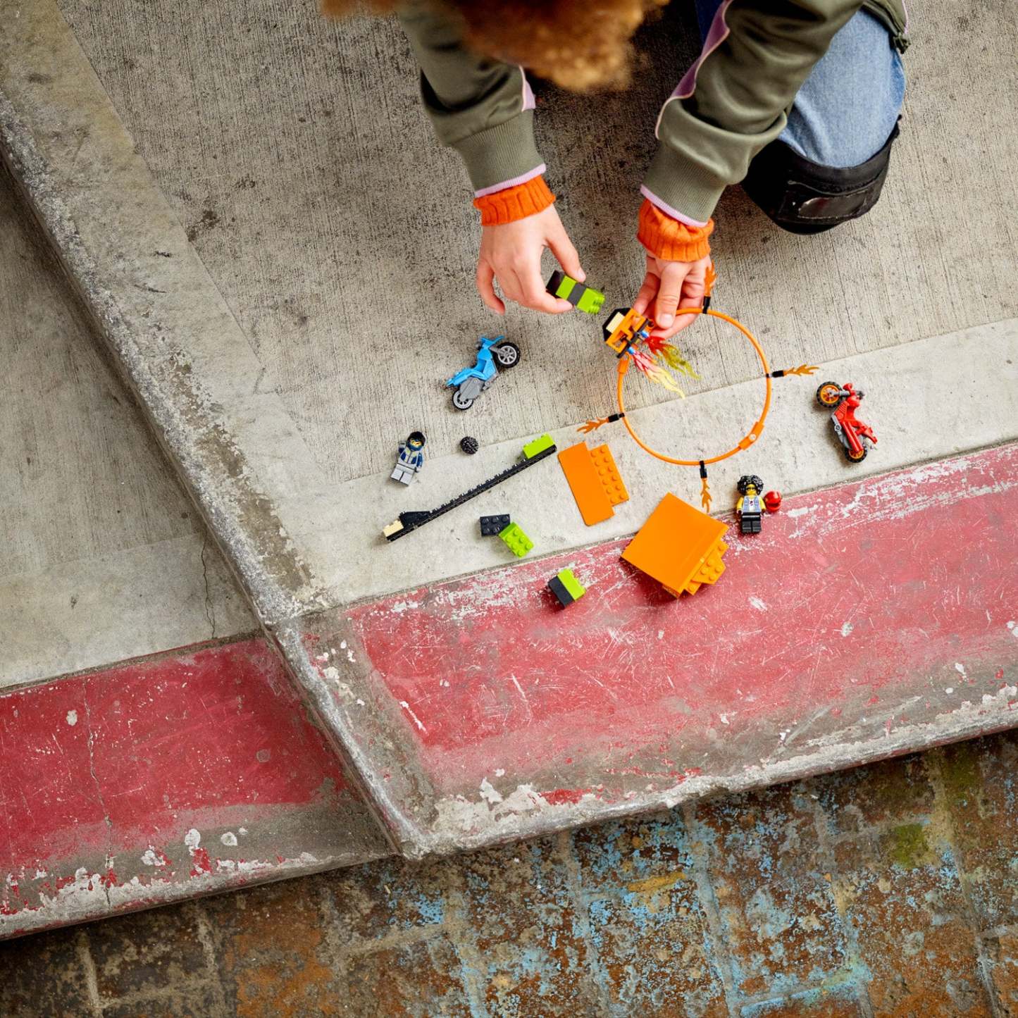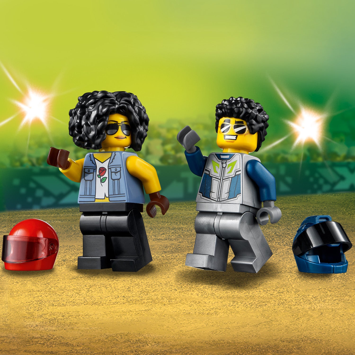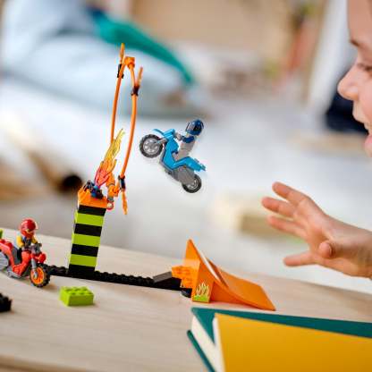 - Kids can enjoy action-packed fun with this LEGO® City Stunt Competition (60299) toy playset, featuring 2 flywheel-powered motorcycles, a stunt course and 2 riders, including a LEGO City TV character.