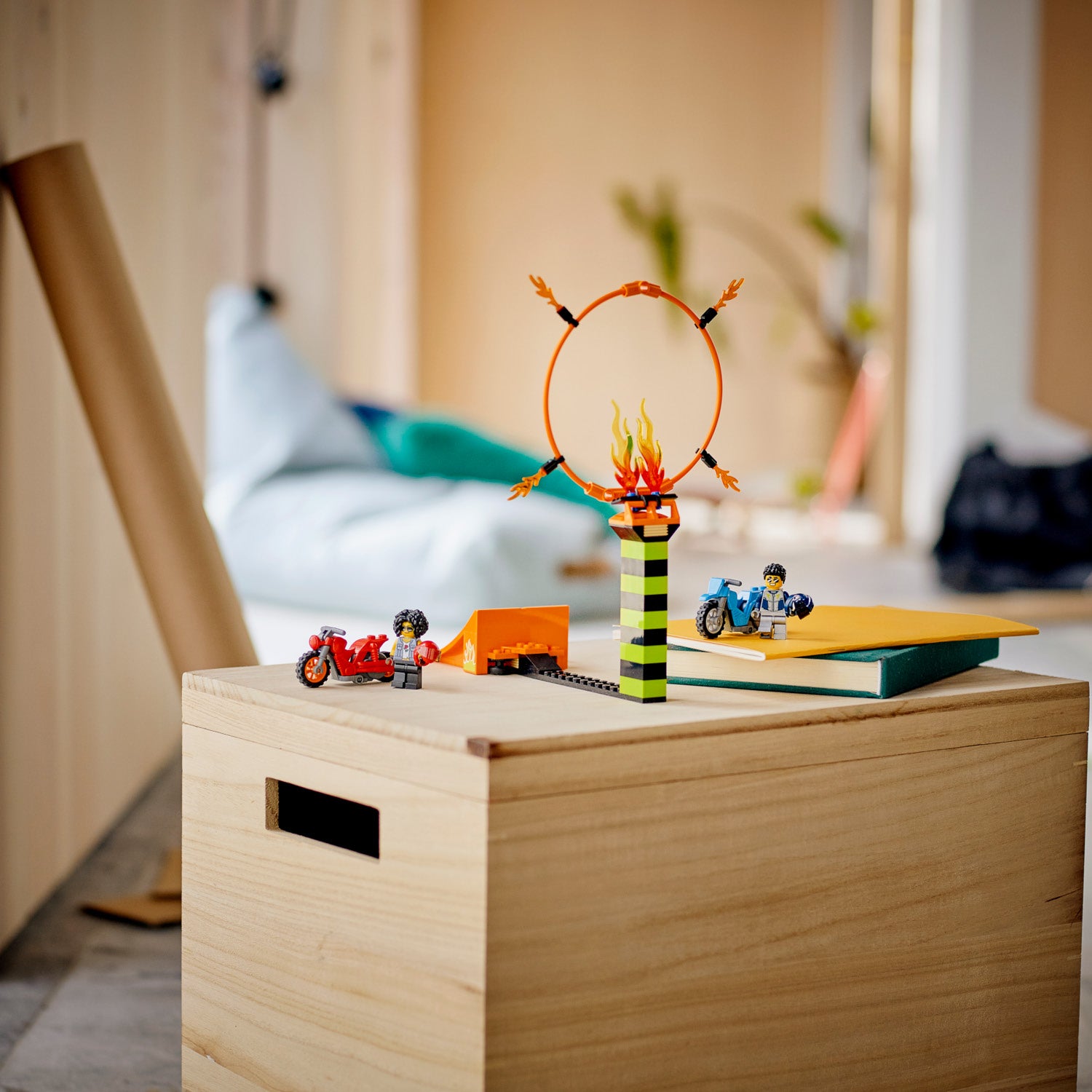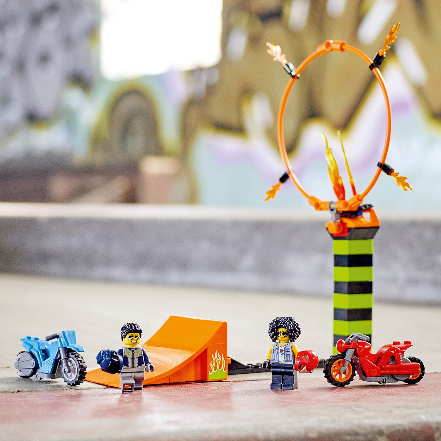 - What’s in the box? A ring of fire, height-adjustable tower, buildable LEGO® flames, 2 flywheel-powered stunt bikes and 2 rider minifigures, including LEGO City TV’s Duke DeTain.